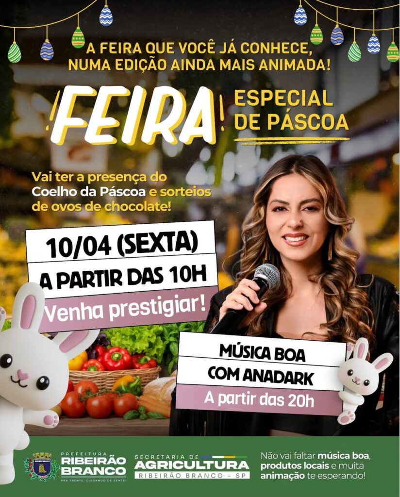 A 13ª edição da Feira do Produtor Rural será realizada no dia 10 de abril, na Praça Matriz, em Ribeirão Branco, com programação temática voltada à Páscoa.