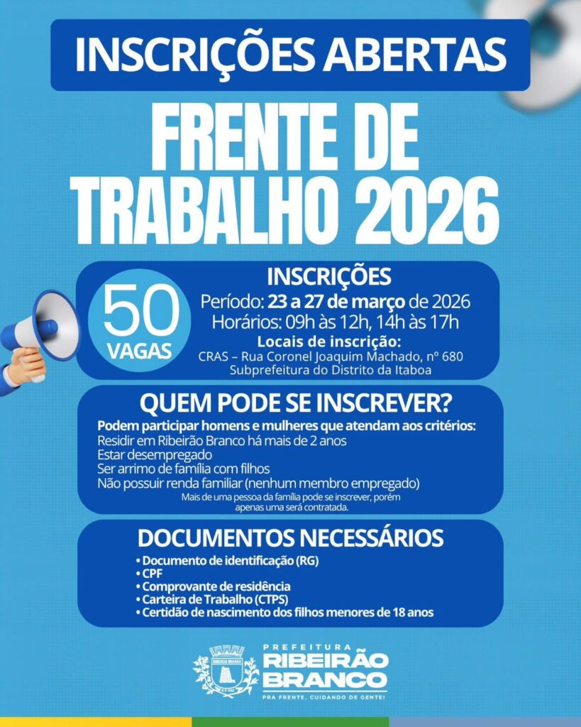 A Prefeitura de Ribeirão Branco abriu inscrições para o programa Frente de Trabalho 2026, com a oferta de 50 vagas destinadas a moradores em situação de vulnerabilidade social. O período de inscrição vai de 23 a 27 de março, com atendimento das 9h às 12h e das 14h às 17h.