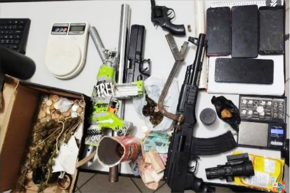 Durante a revista pessoal, foram localizadas porções de crack. Na sequência, em vistoria no imóvel, os policiais encontraram porções de maconha, simulacros de arma de fogo, uma munição intacta de calibre .38, duas balanças de precisão, além de uma caderneta com anotações relacionadas à comercialização de entorpecentes e dinheiro em espécie.