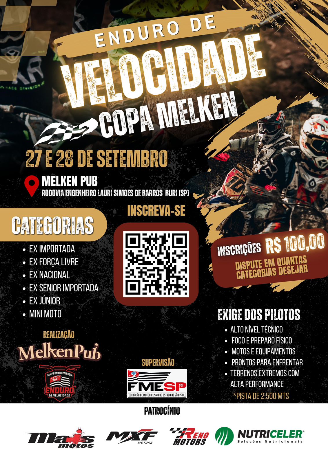 Nos dias 27 e 28 de setembro, o município de Buri será palco do Enduro de Velocidade – Copa Melken, uma competição que promete muita adrenalina e desafios em pista de 2.500 metros, localizada no Melken Pub, às margens da Rodovia Engenheiro Lauri Simões de Barros.