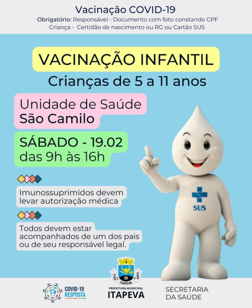 Nesta semana, a vacinação infantil para crianças de 5 a 11 anos, contra a covid-19, acontece amanhã, quarta-feira (16), nas Unidades Rurais, das 12h às 15h, e também, no sábado (19), na Unidade de Saúde São Camilo, das 9h às 16h.