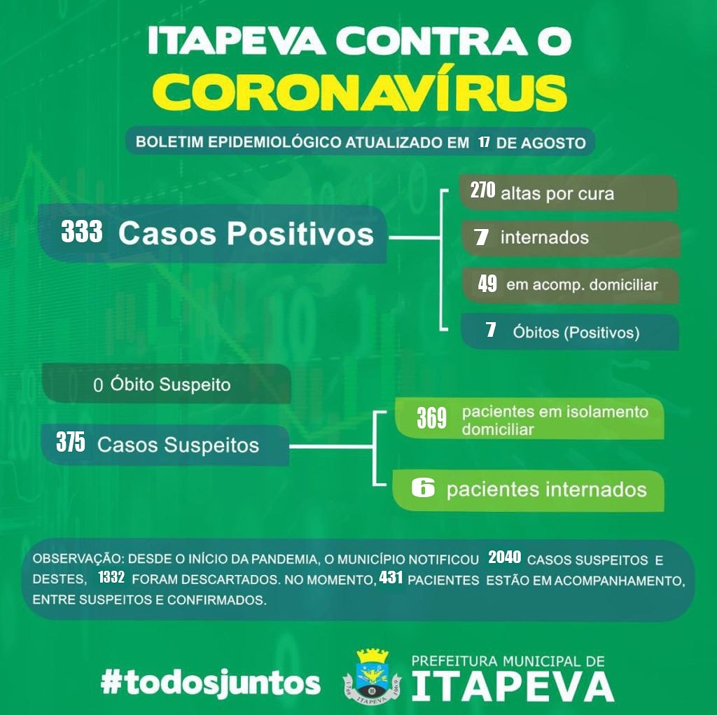 A Prefeitura de Itapeva, por meio da Secretaria de Saúde informa que desde o início da pandemia, Itapeva notificou 2.040 casos suspeitos do novo Coronavírus. Nesta segunda-feira, dia 17 de agosto, o município tem 431 casos em acompanhamento, entre suspeitos e confirmados de Covid-19.