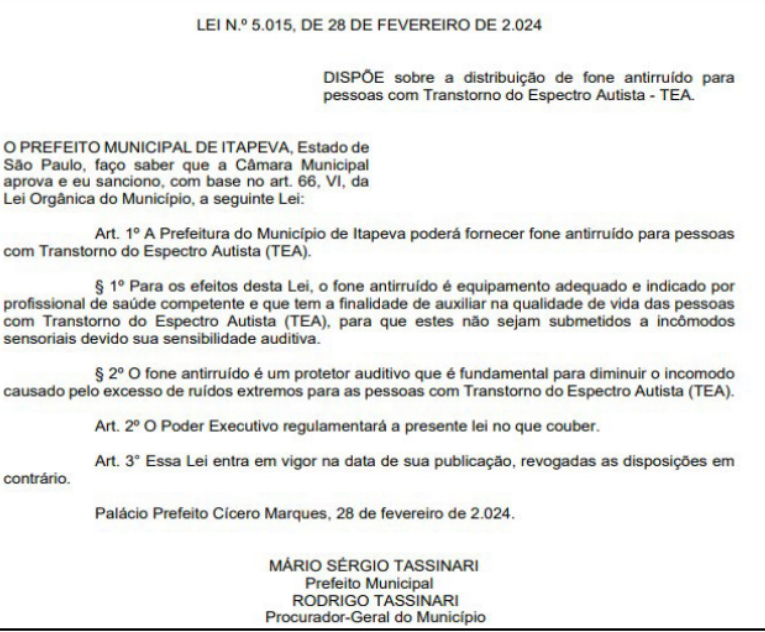 O projeto de lei foi aprovado pelos vereadores itapevenses e encaminhado ao Poder Executivo,que sancionou e a partir desta terça-feira (05) já entrou em vigor. Ainda segundo o vereador Marinho, aqueles que têm TEA e tiverem receita indicando a necessidade do fone antirruído, poderão conseguir gratuitamente com o município.