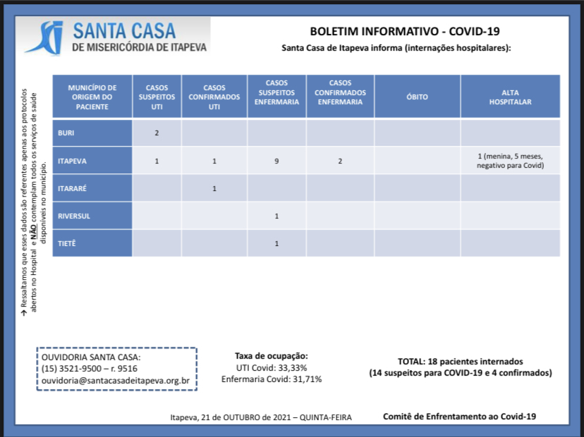 A Santa Casa de Itapeva divulgou em seu boletim que 18 pacientes estão internados na ala Covid, sendo 14 suspeitos e apenas 4 positivos.