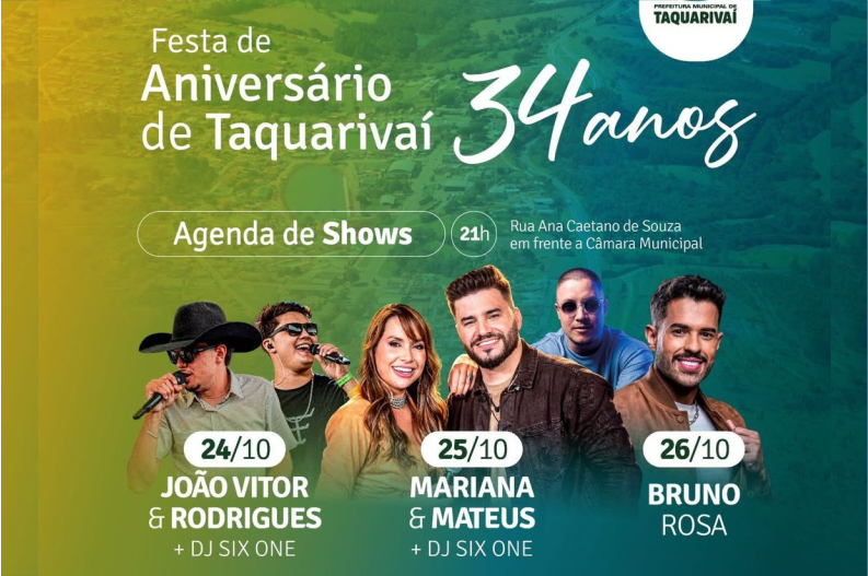 A cidade de Taquarivaí se prepara para comemorar seus 34 anos de emancipação política com uma programação especial que promete agitar o município entre os dias 24 e 29 de outubro. A festa contará com shows musicais, atividades culturais, esportivas e religiosas, reunindo a comunidade em momentos de celebração e lazer.
